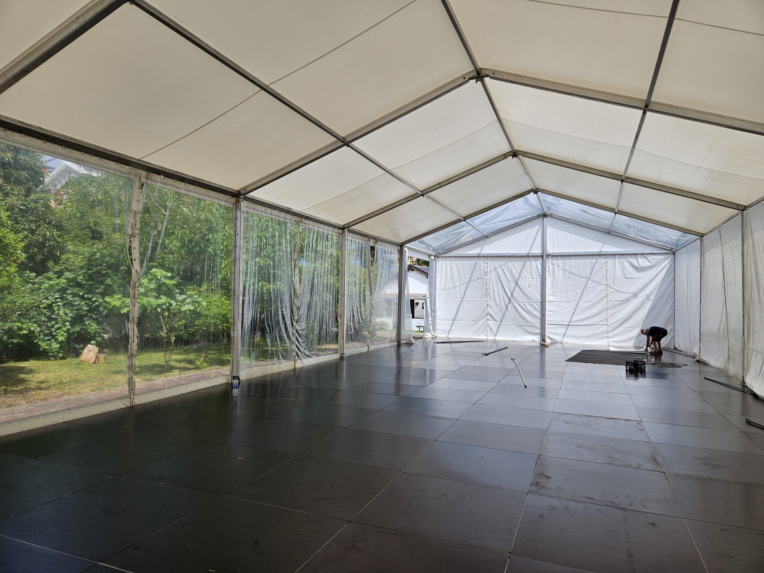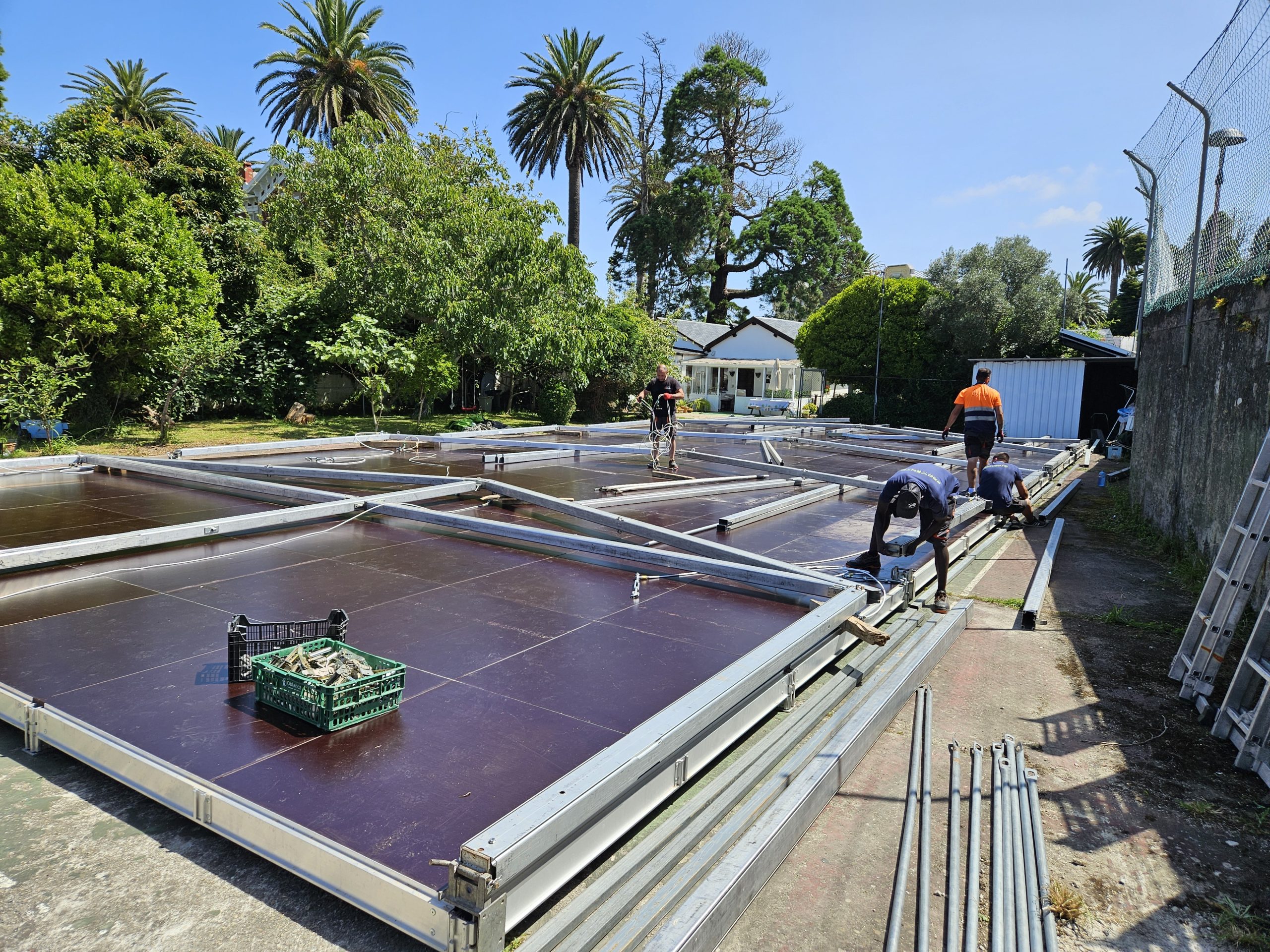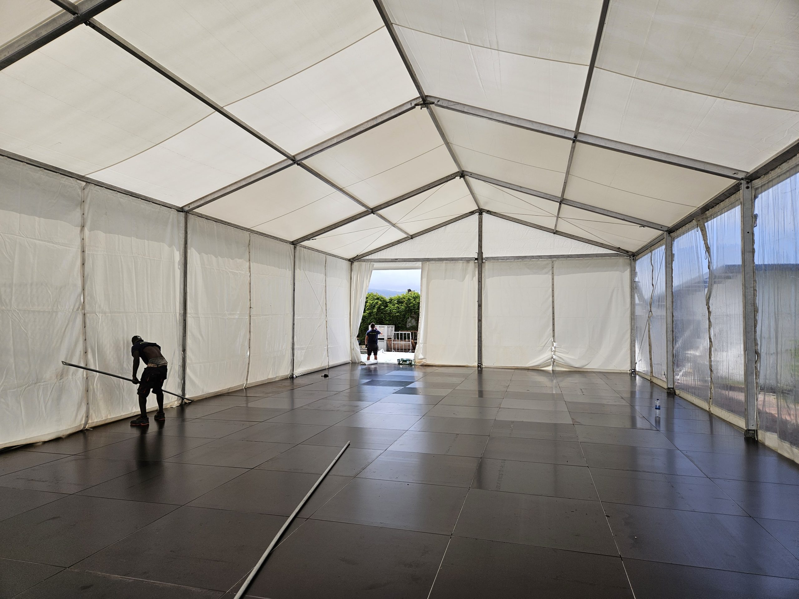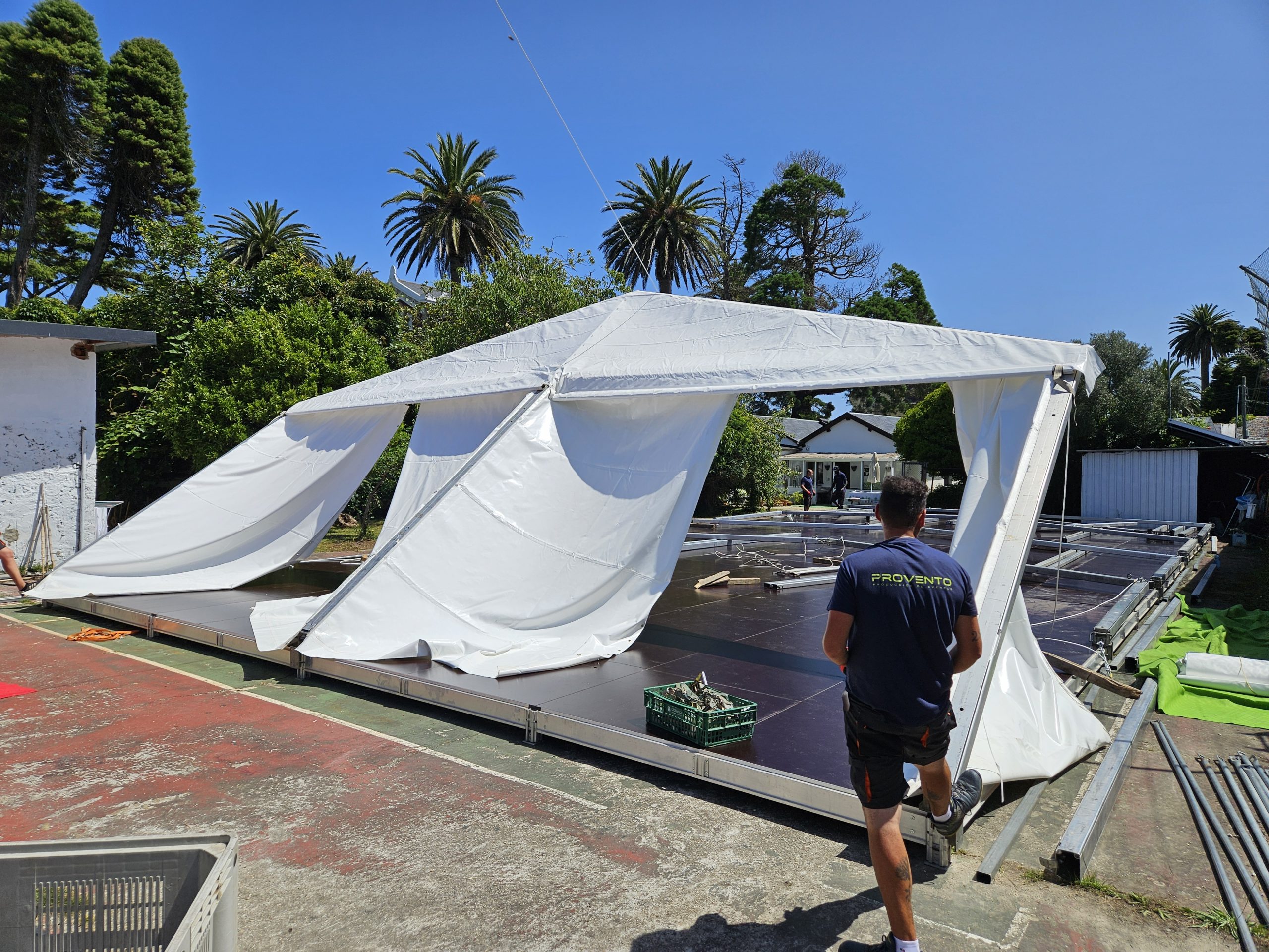 Para esta ocasión, montamos una carpa de 10 x 25 metros en una antigua pista de tenis del hotel. Uno de los laterales era completamente transparente, al igual que el techo de la pista de baile. Además, para no dañar la pista de tenis, en lugar de anclar la carpa al suelo, utilizamos una tarima modular a modo de contrapeso, la cual le dio más seguridad y fue menos agresivo para el espacio. Sobre la tarima se instaló una moqueta ferial que hizo el espacio más acogedor.