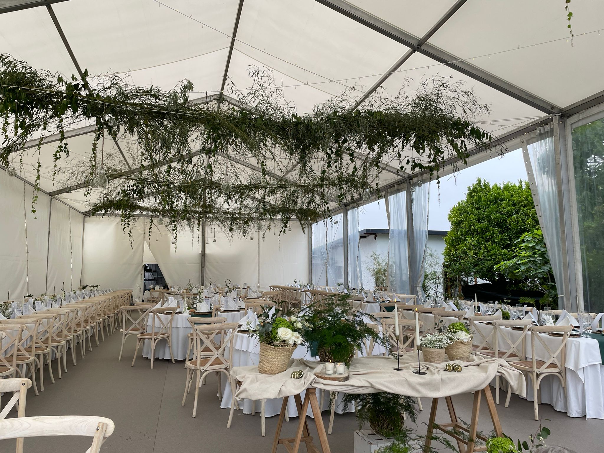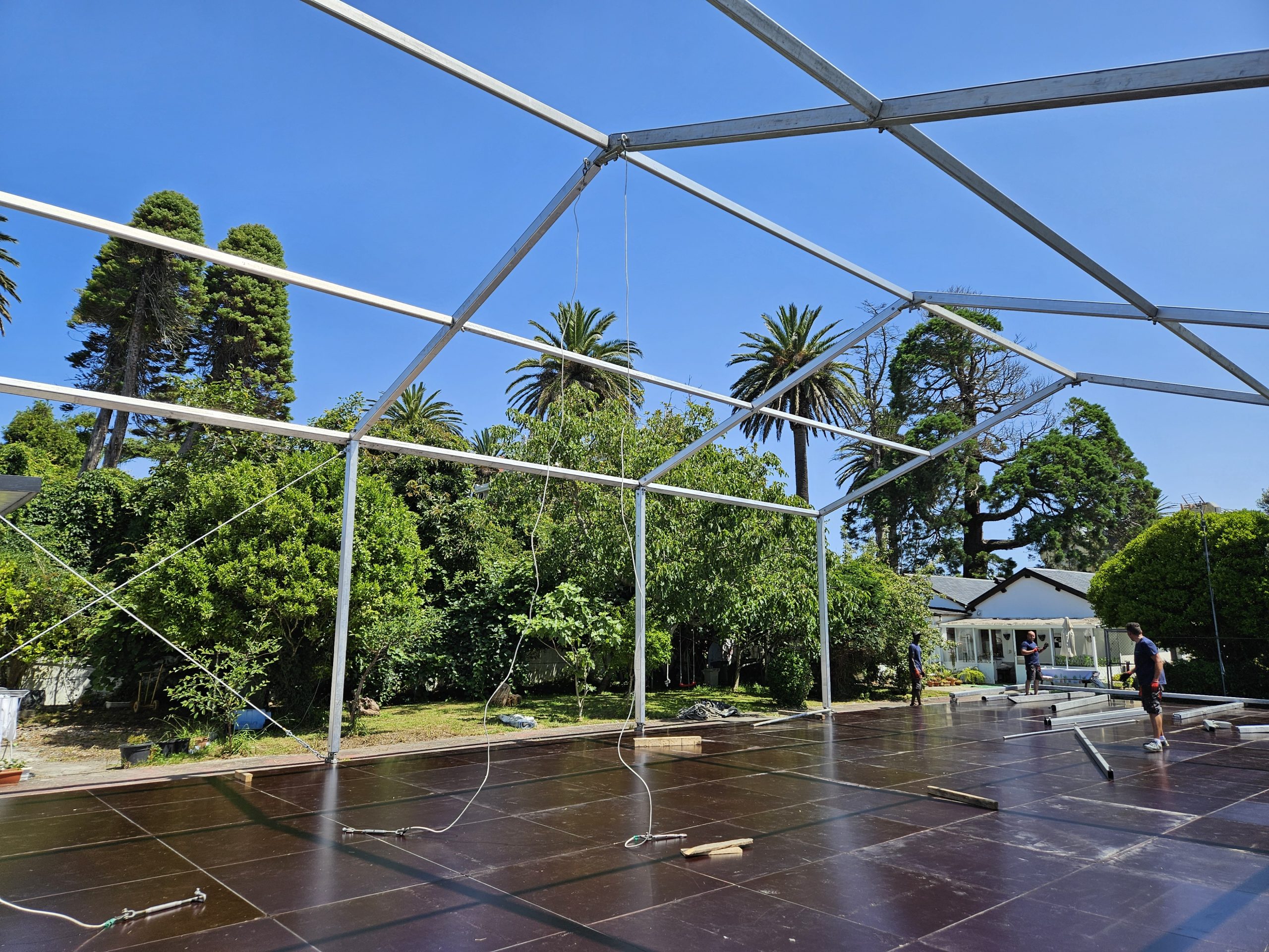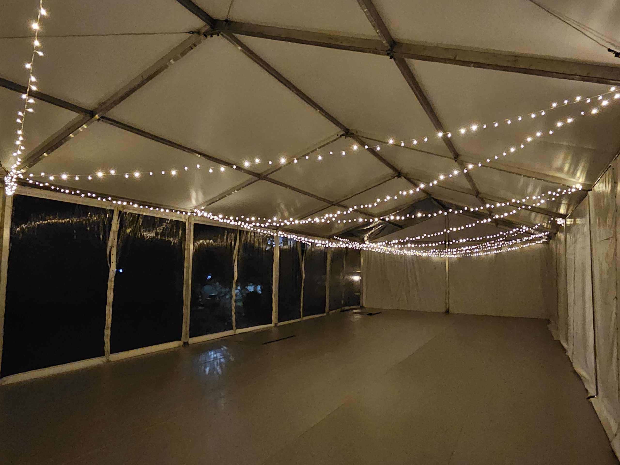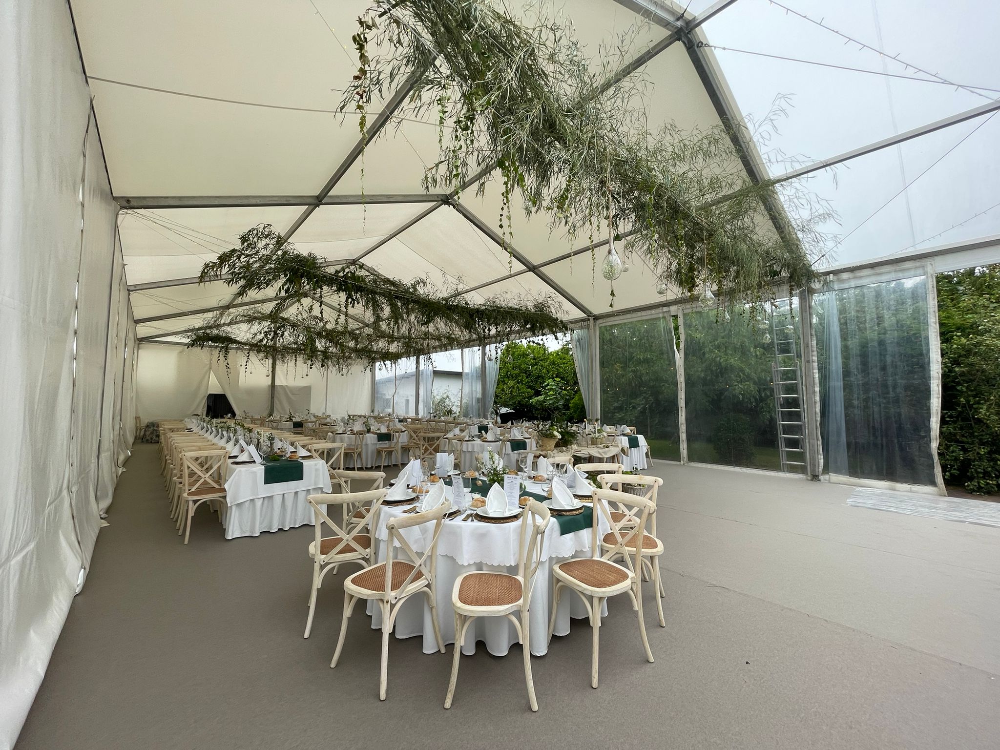 Para esta ocasión, montamos una carpa de 10 x 25 metros en una antigua pista de tenis del hotel. Uno de los laterales era completamente transparente, al igual que el techo de la pista de baile. Además, para no dañar la pista de tenis, en lugar de anclar la carpa al suelo, utilizamos una tarima modular a modo de contrapeso, la cual le dio más seguridad y fue menos agresivo para el espacio. Sobre la tarima se instaló una moqueta ferial que hizo el espacio más acogedor.